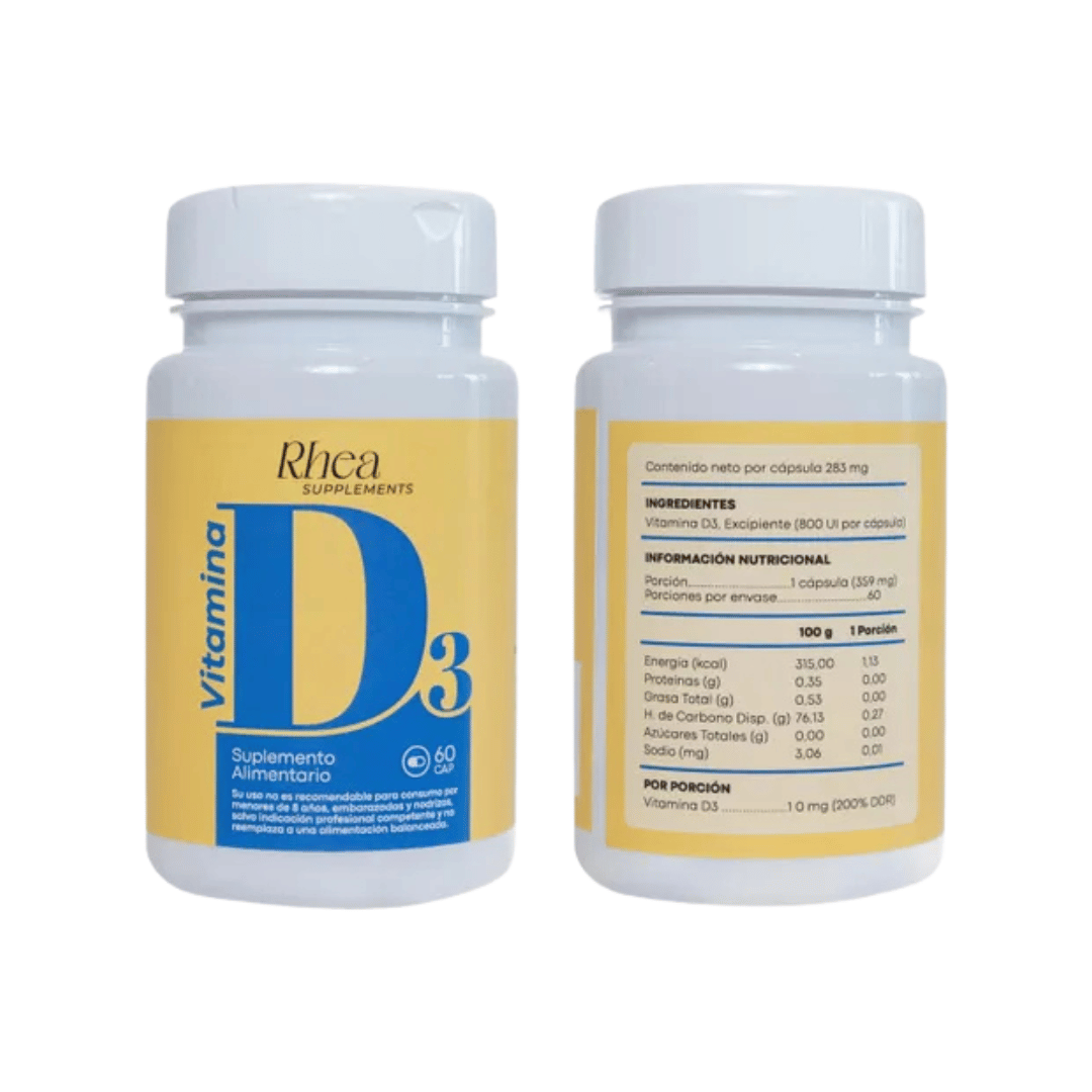 La Vitamina D3 de Rhea Supplements proporciona 800 UI por cápsula, contribuyendo al mantenimiento normal de huesos, dientes y músculos, así como al correcto funcionamiento del sistema inmunológico. Este suplemento es ideal para personas con baja exposición al sol o que necesitan fortalecer sus defensas de forma natural.